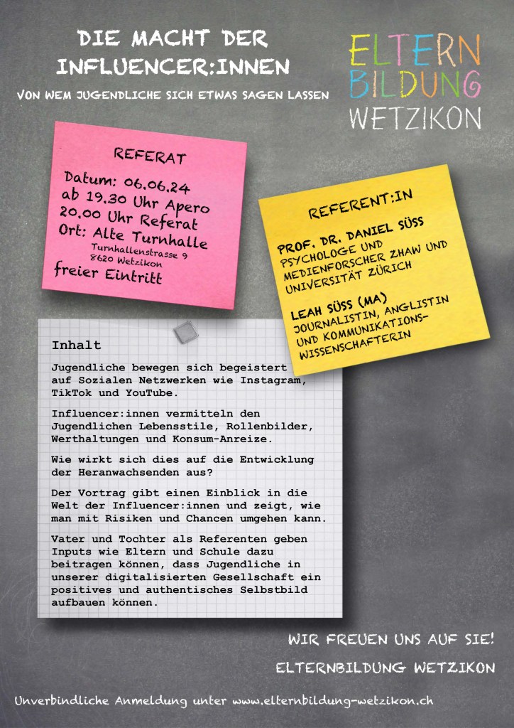 Die Macht der Influencer:innen Auf Anfrage senden wir Ihnen die Folien des Vortrags gerne per Mail zu:elternbildung-wetzikon@mail.ch Umfrage / Feedback zum Anlass