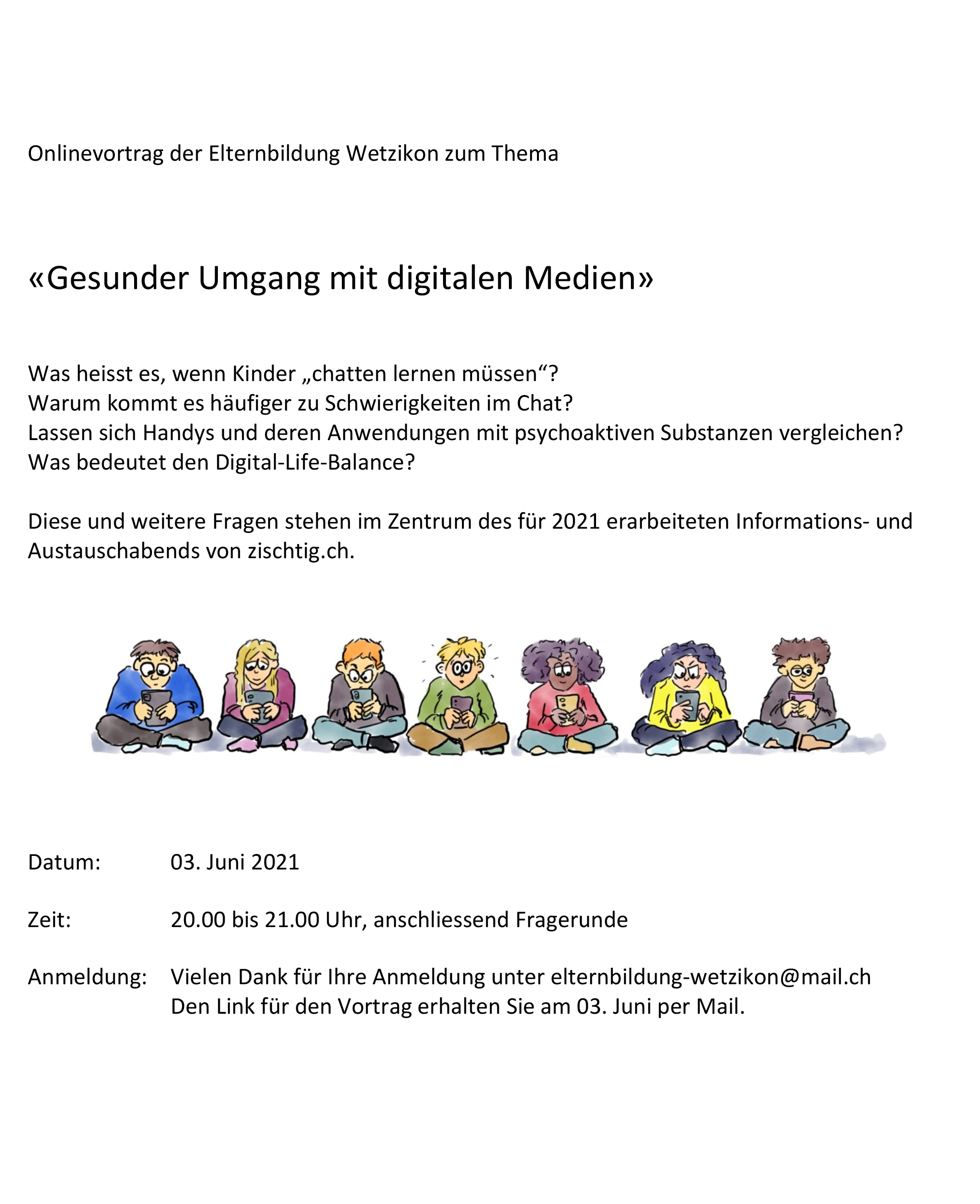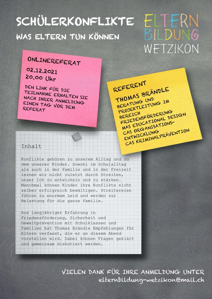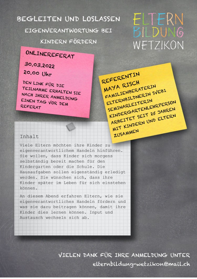 Den Link für die Teilnahme erhalten Sie nach Ihrer Anmeldung unter elternbildung-wetzikon@mail.ch einen Tag vor dem Referat.