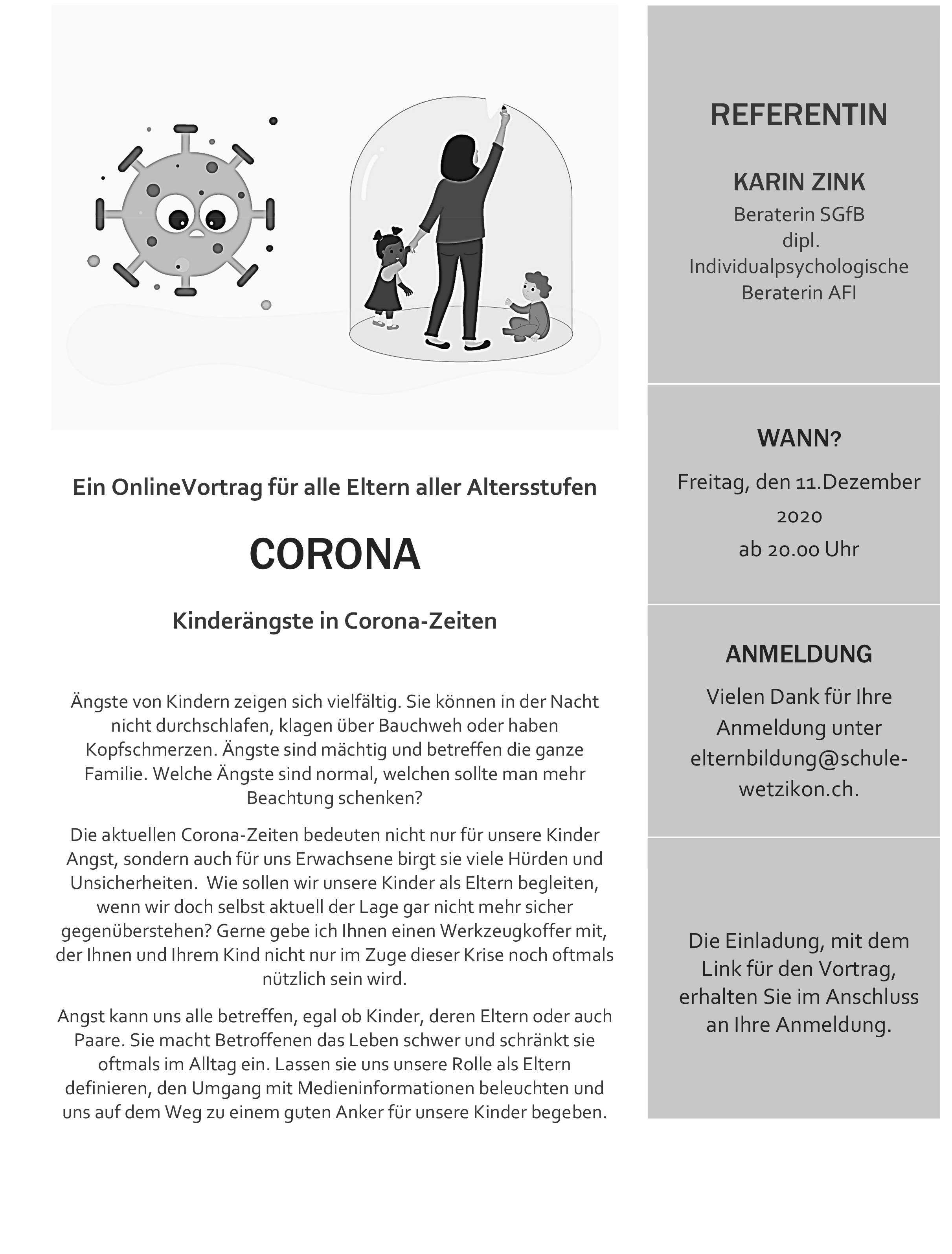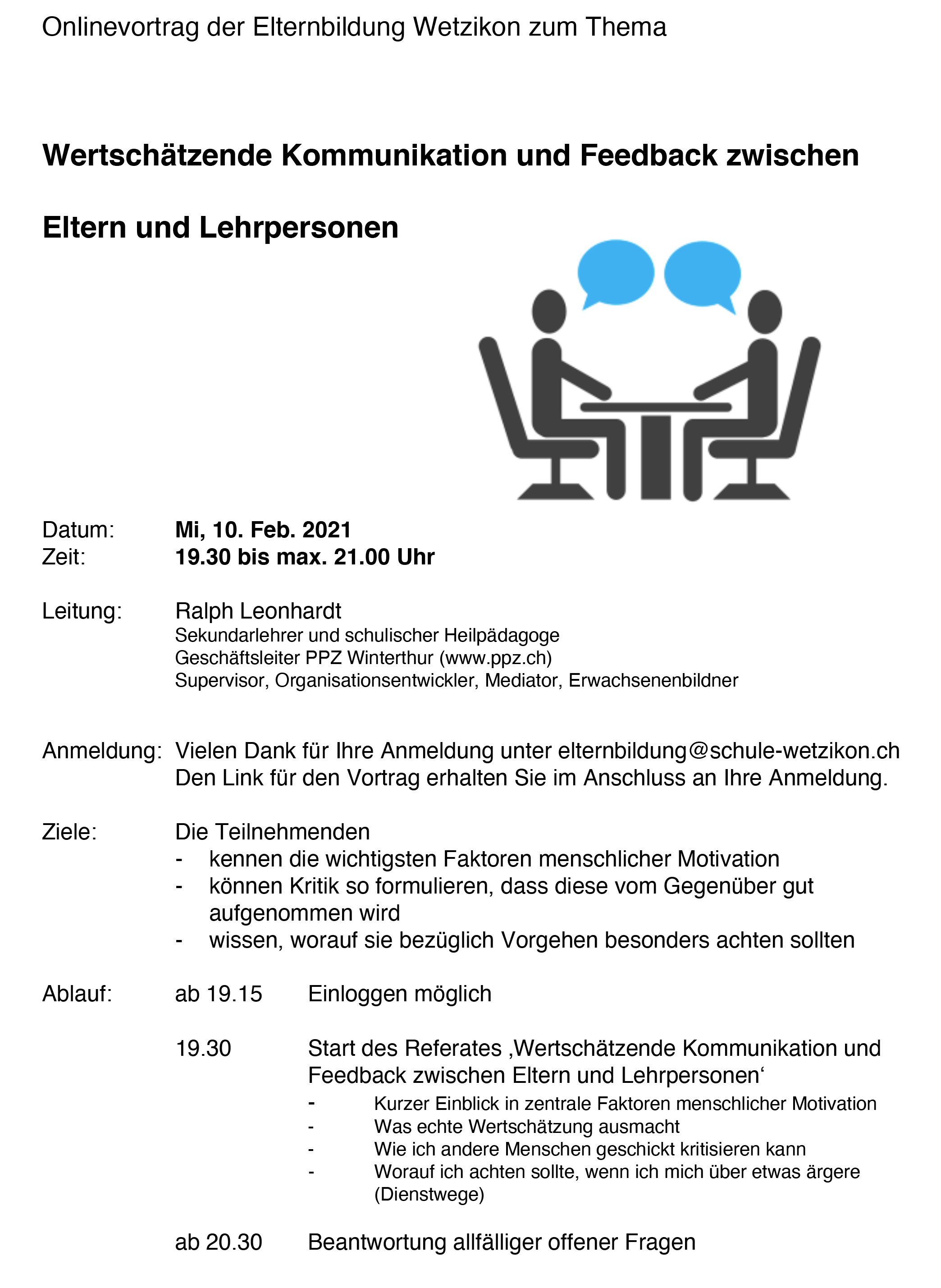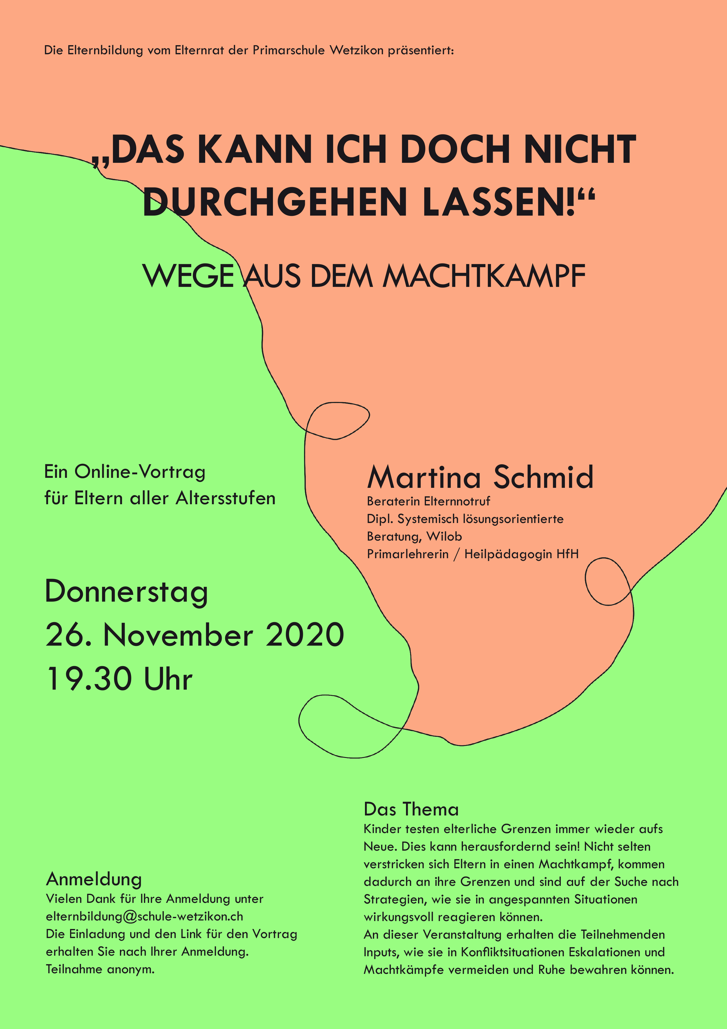 Den Link für die Teilnahme erhalten Sie nach Ihrer Anmeldung unter elternbildung-wetzikon@mail.ch einen Tag vor dem Referat.